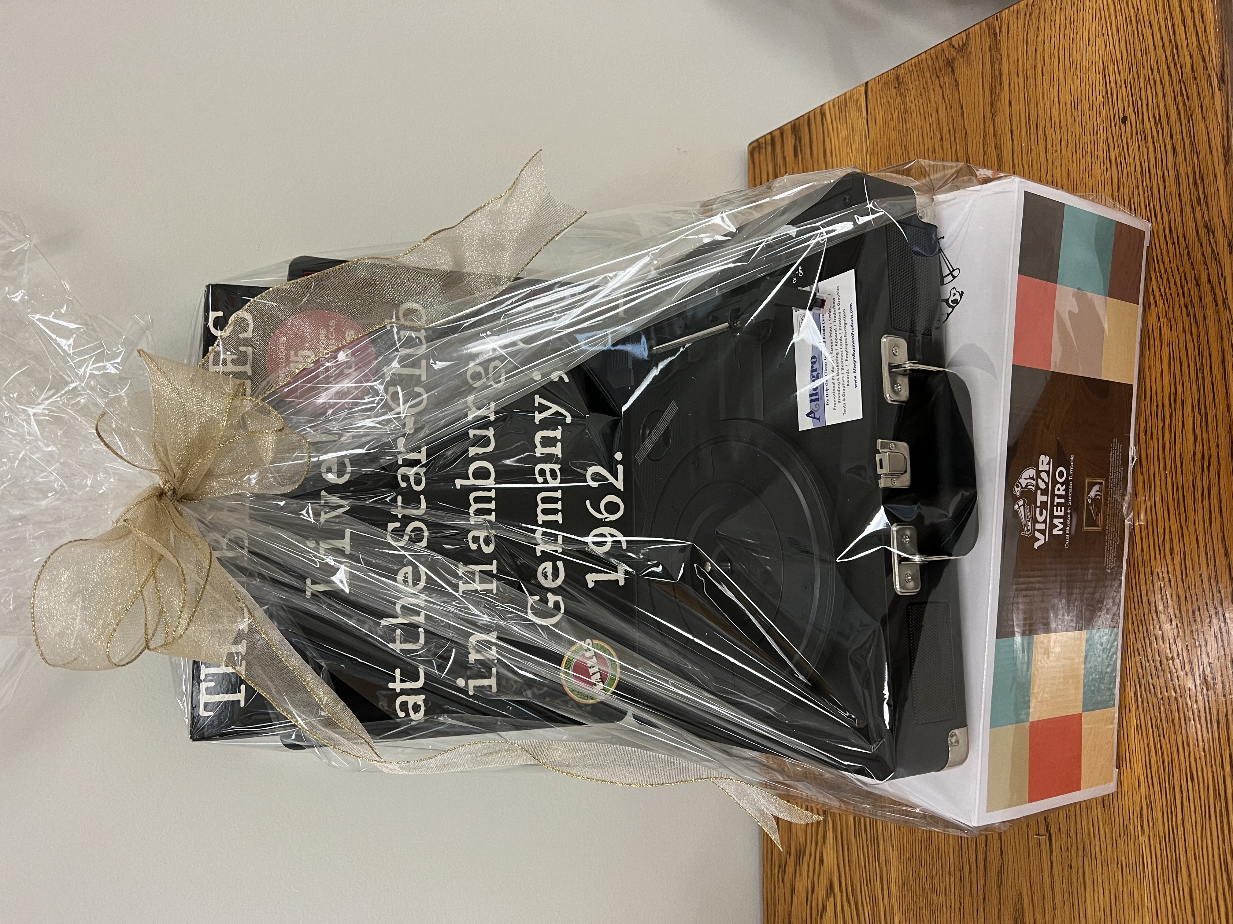We always have a great time at the Cherokee County Educational Foundation Gala. Not only did Lori and David attend, but Allegro is also a sponsor. This year Allegro Business Products donated bottle souvenirs for all the guests that attended. (Souvenir bottle is shown above in the middle of the collage). Allegro also donated a logo'd record player (pictured above), along with a record for the auction that fit in with the Beatle's theme!